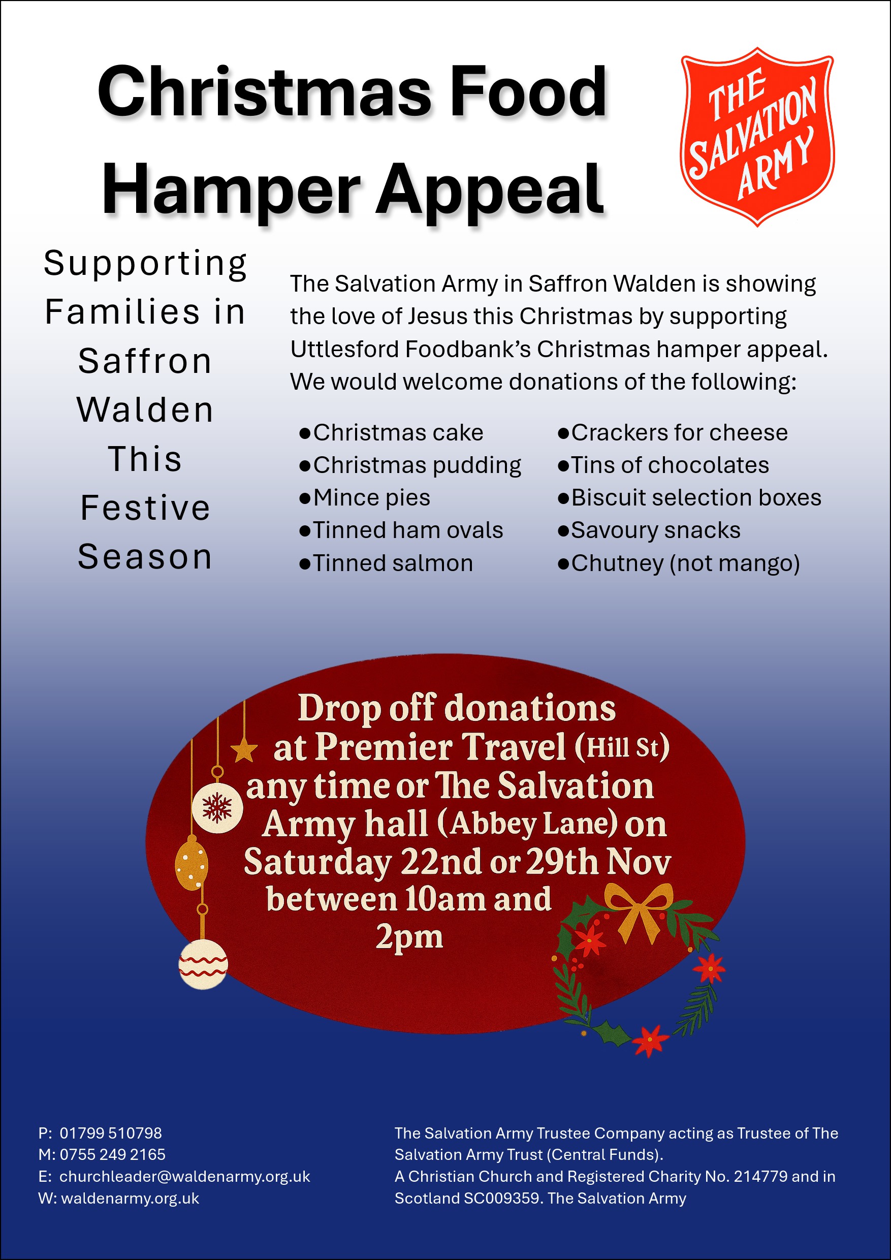 The Salvation Army in Saffron Walden is showing the love of Jesus this Christmas by supporting the FoodBank’s Christmas hamper appeal. We would welcome donations of the following: ●Christmas cake ●Christmas pudding ●Mince pies ●Tinned … Continue reading Christmas Hamper Appeal →
